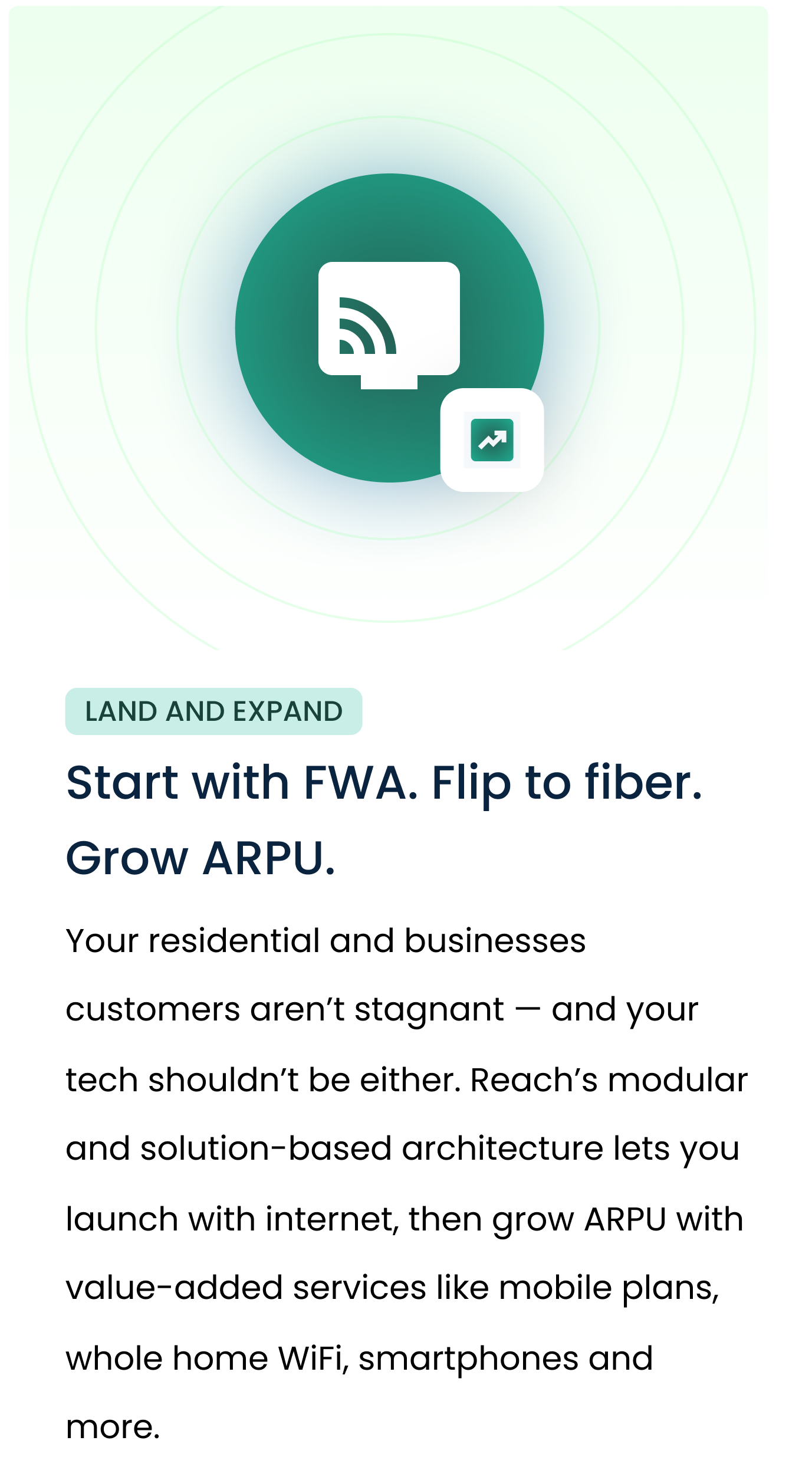 Reach Fixed Wireless uses 5G and LTE to connect homes and businesses quickly, so you can grow beyond your current footprint, fast.